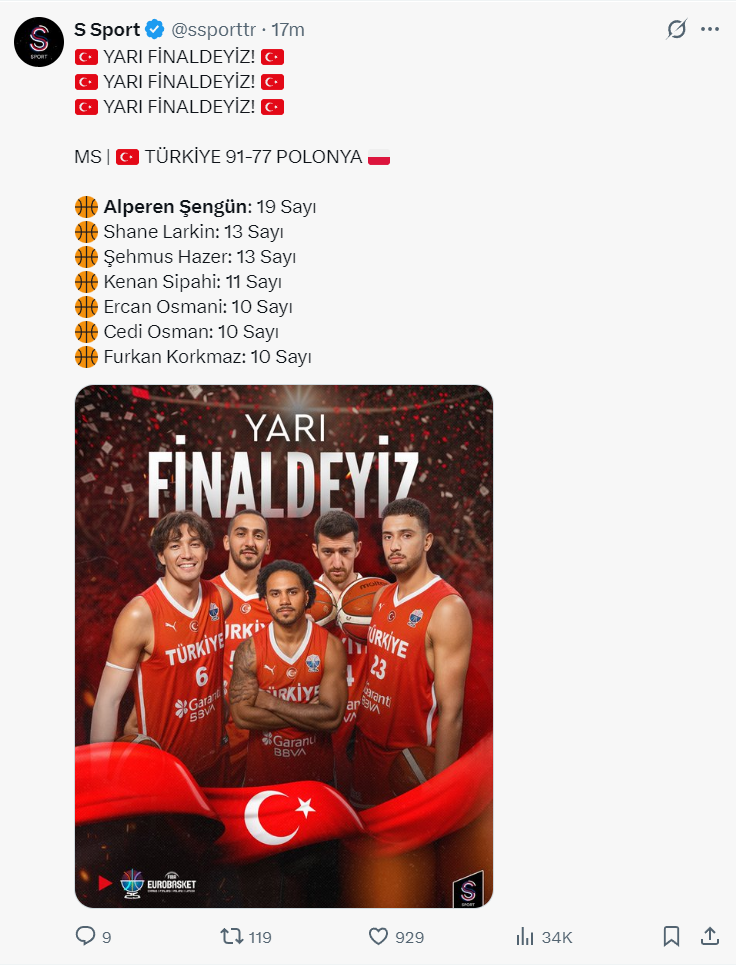 土耳其媒体:这是土耳其2001年后首次打到半决赛,那一年土耳其是亚军他们有年轻的特科格鲁,而如今年轻的申京带领土耳其重返半决赛,这已经是土耳其最好的一代?