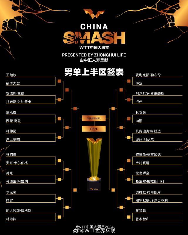继新加坡、沙特之后,今年第三站WTT大满贯赛事中国大满贯首度落户北京,9月27日下午,正赛抽签仪式在首钢国际会展中心举行。男单头号种子王楚钦和年轻队友林诗栋、向鹏同在上半区,巴黎奥运会后首次亮相赛场的马龙和梁靖崑、林高远等人同在下半区,大家将在主场迎来包括卡尔德拉诺、莫雷加德、张本智和等外协会名将的冲击。